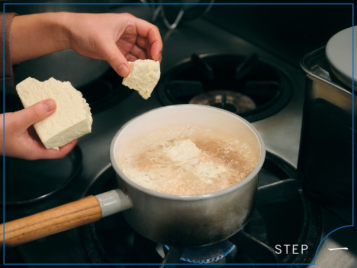 豆腐をちぎるときは、1丁を一口大くらいの大きさにしてください。豆腐を下ゆですることで、余分な水分が抜けて、豆腐に味が染み込みやすくなります。