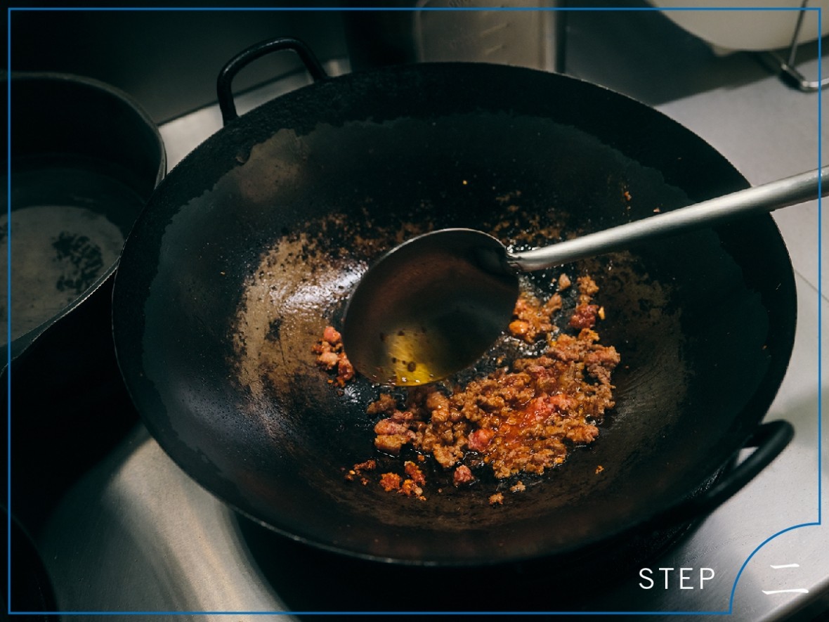 みじん切りにしたニンニクと生姜、豆板醤を炒める。香りが出てきたらひき肉を加え、しっかりと炒める。香辛料の香りを肉に移すイメージで。