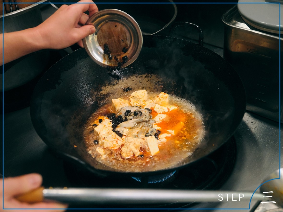 水、醤油、砂糖、豆豉(トーチ)、牡蠣を入れ、中火で5分煮込む。