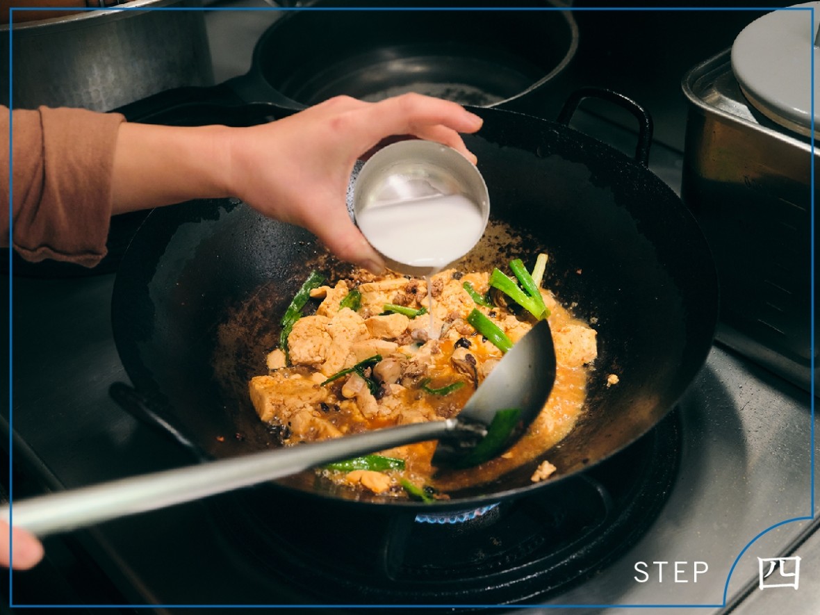 下ゆでした豆腐を入れ、炒めた肉の香りを豆腐に移すように、全体的になじませる。